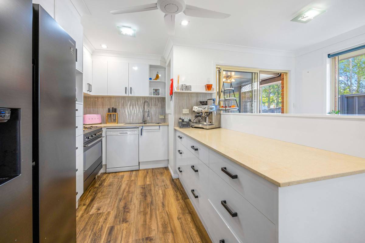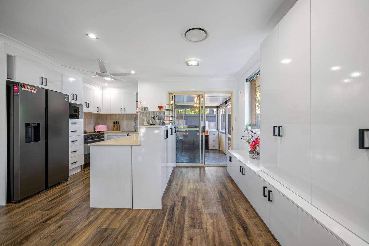 The property comprises a contemporary stone kitchen with a freestanding gas cooktop & dishwasher, timber-look flooring, zoned-ducted reverse-cycle air-conditioning & clever storage solutions throughout.