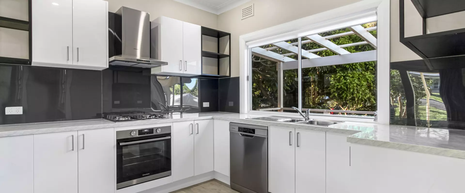 ⦁ Open modern kitchen with dishwasher & gas cooktop