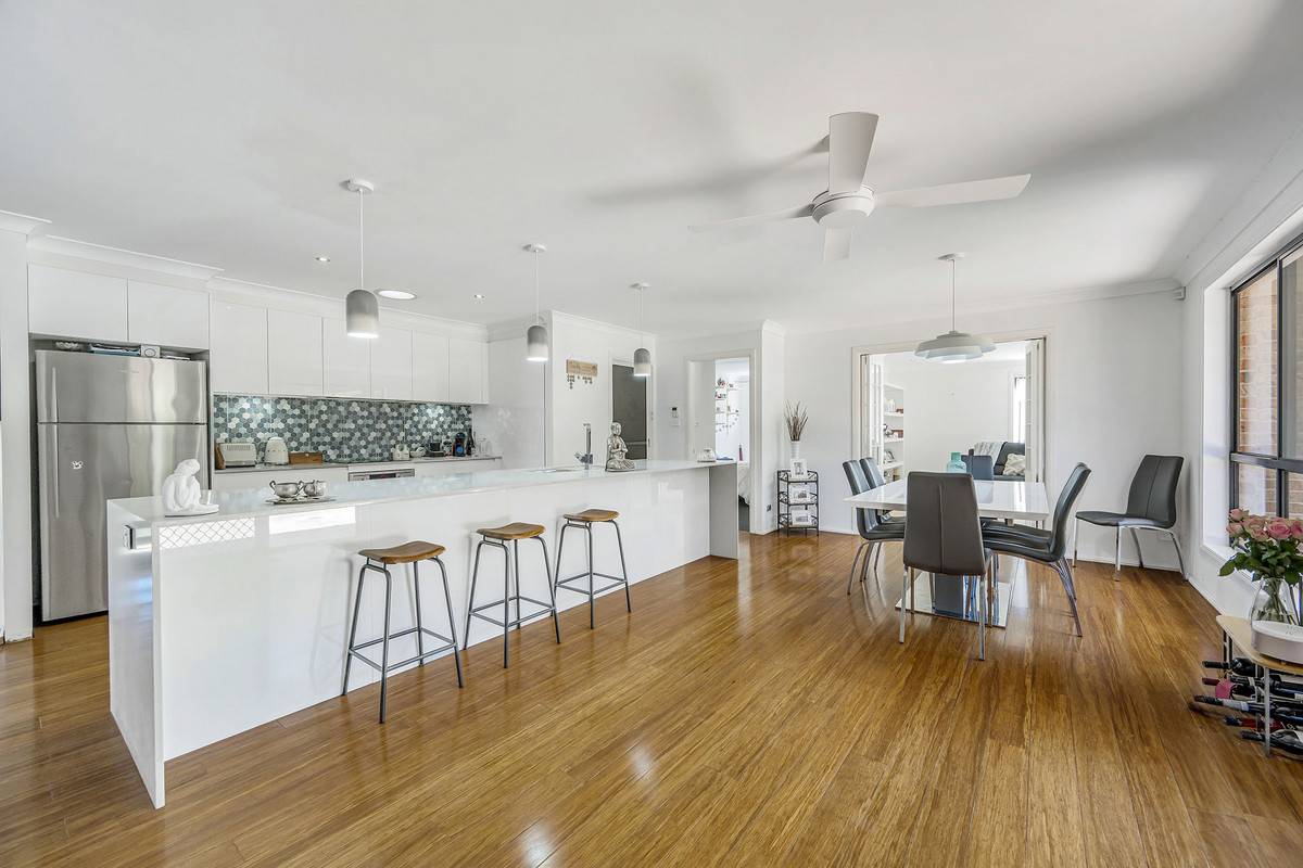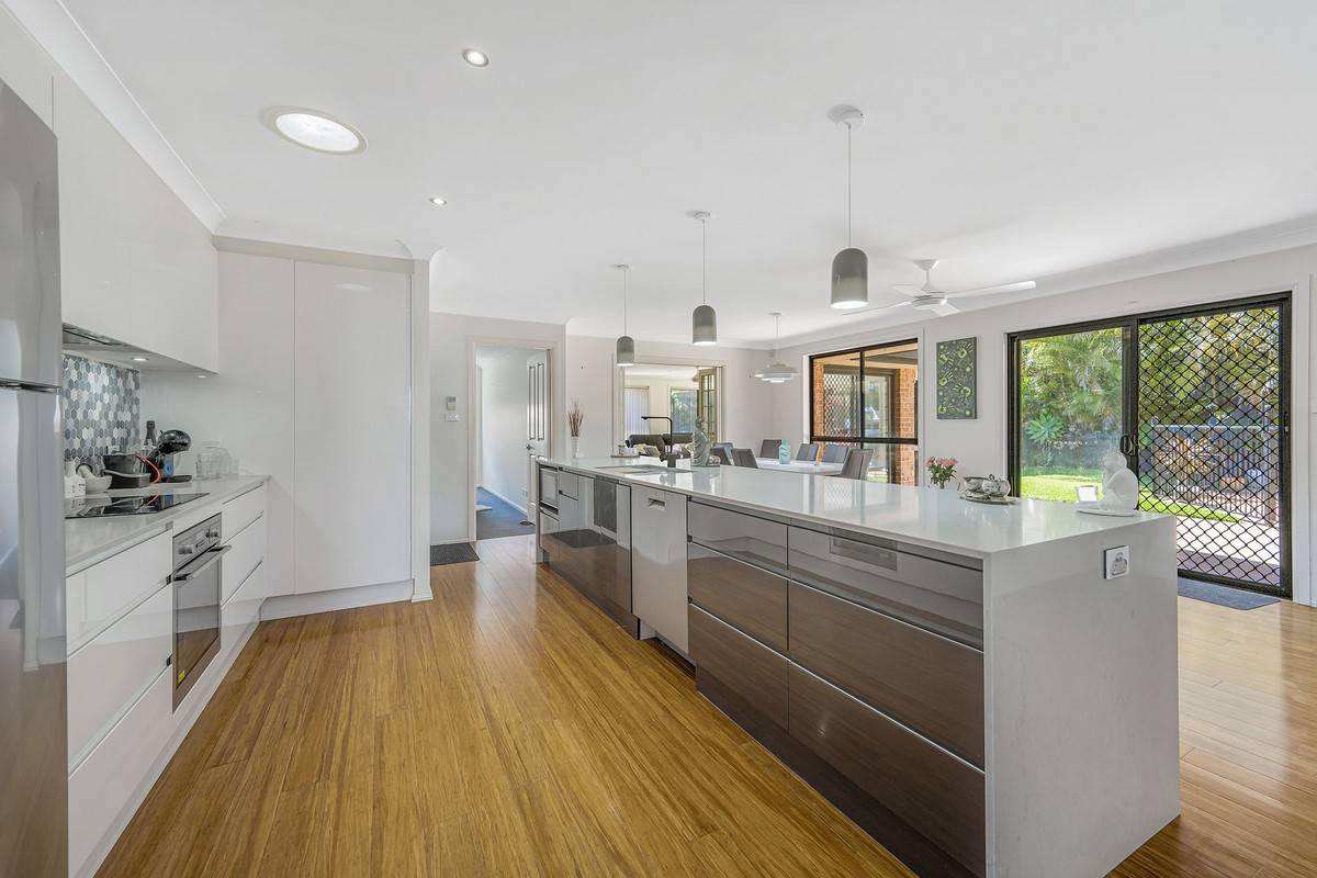 At the rear of the residence is the heart of the home with beautiful timber flooring, the well-equipped kitchen is adjacent to the family dining room and features waterfall benchtops, quality appliances & an abundance of storage with large fridge space.
