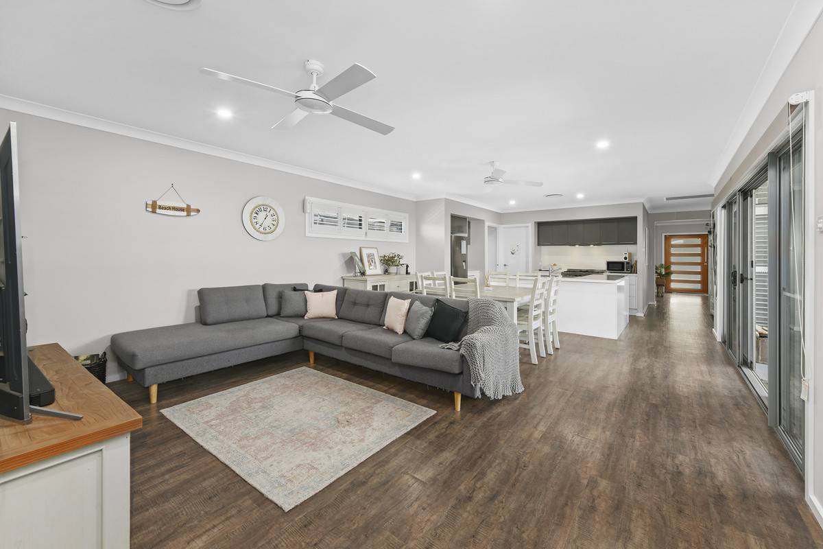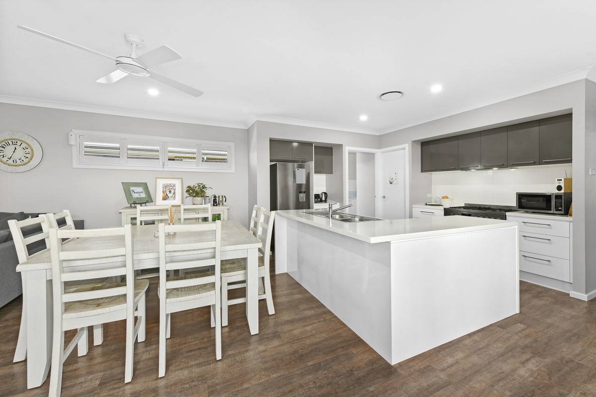 Entertaining is effortless with the impressive kitchen boasting 40mm stone benchtops, a walk-in pantry, and premium appliances. Timber-look laminate flooring throughout the kitchen and living areas ensures easy upkeep, while the seamless indoor/outdoor flow invites relaxation in the spacious covered alfresco area.
