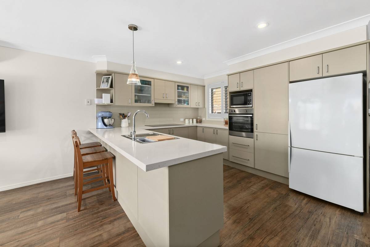 The open-plan kitchen/living/dining area is spacious & light-filled. The vinyl plank floors and plantation shutters are stylish and functional. The reverse cycle AC will keep you comfortable all year round. The kitchen features a breakfast bar and lots of storage, bench space, and updated appliances such as a 5 burner induction cooktop, and dishwasher.
